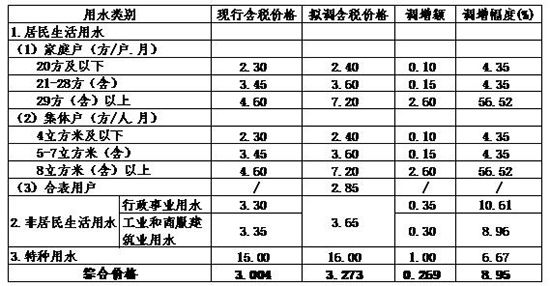 《方案》指出,通过对新增成本的因素考虑,并综合计算之后,深圳综合水价应为3.273元/立方米。据此,市发改委具体提出了两套阶梯水价调整方案,其综合价格均较原来上涨0.269元/立方米,增长幅度均为8.95%。调整范围涉及居民生活用水、非居民用水和特种用水3类。