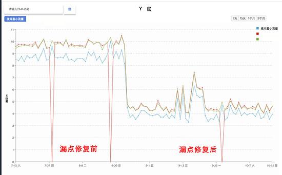 2017年8月,基于DMA示范区在LeakView®系统上的数据分析,水联网配合水司对Y区进行了现场复查工作,在复查工作中发现疑似漏水点。随即水司对已探测到的漏点,进行修漏工作,通过修复后日水量节约120立方米,年节水量约为4.4万立方米。