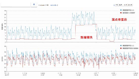 2017年11月,LeakView®系统显示该区域内的夜间流量明显上升至21.4 立方米/时,监测点压力与入水口压力差值增大,日水量突增至700 立方米/天,综合管网基础信息、压力监测设备数据以及机器学习能力等信息,LeakView®系统迅速对流量情况发出新增漏失报警,以派发工单的形式告知并建议对相关区域进行漏点普查工作。在示范区内的某单位门口发现*处漏点,通过修复工作,区域恢复到之前运行水平,年节水17万立方米