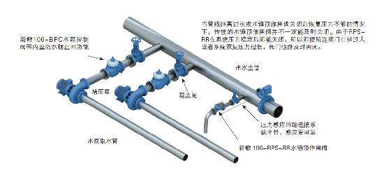 RPS-RR型阀门在感应到系统压力出现异常变化也就是感应到水锤来临时迅速开启。此阀门配置了两套导阀感应回路,每套导阀通过感应回路连接到水泵后端的连通管道上。其中,81-RP型高压导阀在感应到系统压力超过正常设定值时迅速开启,排放过高的压力;而81-RPD型压差导阀则感应主阀隔膜两边的压差。由于该导阀感应到的是连通管及阀门之间的压差而低压通常是发生在水锤发生的*初阶段,所以在高压水锤来临前,阀门有足够的时间预开启,从而消除系统由突然断电而产生的水锤。